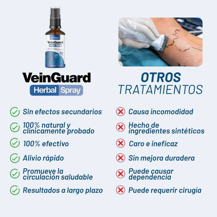 A diferencia de los tratamientos invasivos o costosos, VeinGuard Herbal Spray ofrece: